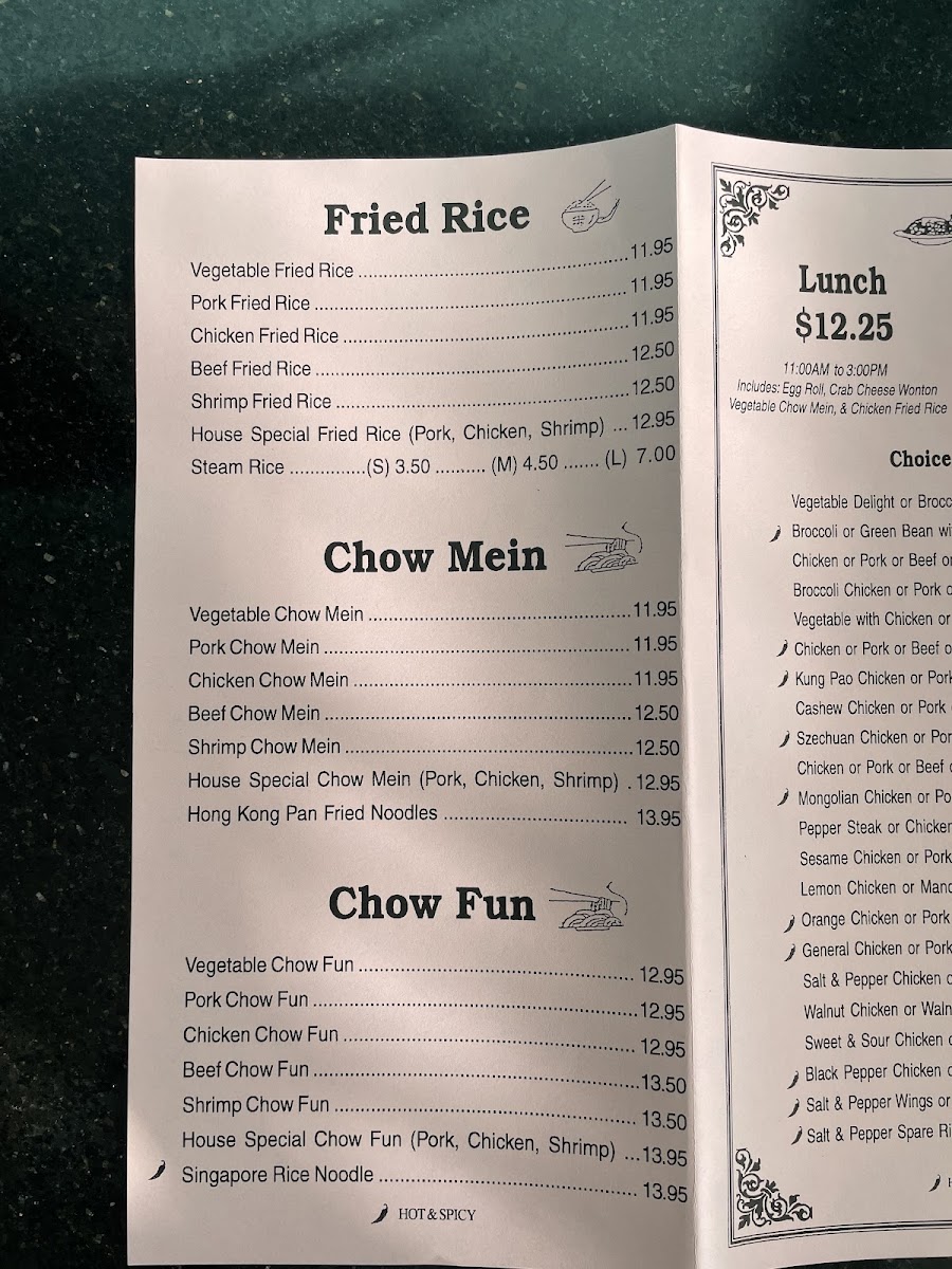Chow Fun dishes feature Vegetable Chow Fun, BBQ Pork Chow Fun, Chicken Chow Fun, Shrimp Chow Fun, Beef Chow Fun, and a House Special Chow Fun that combines pork, chicken, and shrimp.