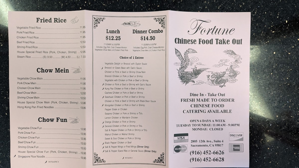 The menu at Fortune Chinese Food Take-Out offers a variety of traditional American-Chinese dishes, suitable for quick orders and take-out meals. It is organized into several main categories, allowing customers to choose from a selection of fried rice, chow fun, and combo meals.