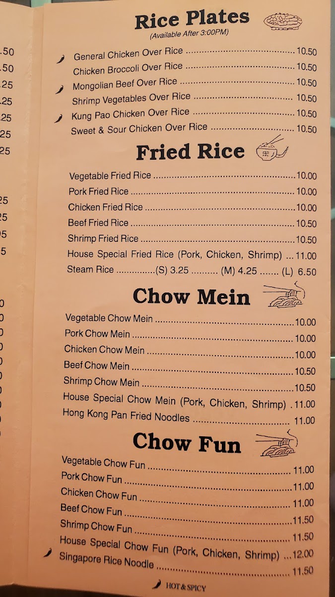 Fried Rice options include Vegetable Fried Rice, BBQ Pork Fried Rice, Chicken Fried Rice, Shrimp Fried Rice, Beef Fried Rice, and House Fried Rice.